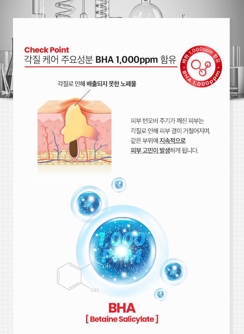각질 케어 주요 성분 BHA 1,000ppm 함유 각질로 인해 배출되지 못한 노폐물 각질을 부드럽게 정돈하는 BHA가 피부 각질층의 턴오버 주기를 관리해 깨끗한 모공으로 관리하는데 도움을 줍니다. 피부 턴오버 주기가 깨진 피부는 각질로 인해 피부 결이 거칠어지며, 같은 부위에 지속적으로 피부 고민이 발생하게 됩니다.