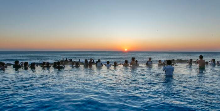 강릉 '씨마크 호텔'의 5층에 위치한 '클럽 인피니티'에는 실내외 수영장이 있어 온수풀에서 일출을 감상할 수 있습니다. 동해바다를 한눈에 볼 수 있는 야외 인피니티 풀 '비치 온 더 클라우드'와 실내 수영장 '더 풀'은 사계절 내내 온수로 운영하고 있으며, 동해바다와 경포 호수, 태백산맥을 조망할 수 있어 새해 해돋이 관광 명소로 꼽히는 곳 중 하나입니다.
