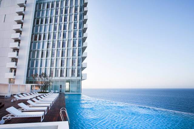 스카이베이 호텔은 18년 1월에 개장하여 지상 최대 20층, 스카이브릿지로 연결된 2개의 동으로 이뤄져 있어 마치 싱가포르 마리나베이 샌즈호텔을 연상케 합니다. 해외 유명 관광지의 특급호텔에서 볼 수 있는 인피니티 풀(옥상 야외 풀)은 최상층인 20층에 마련되어 있습니다. 바다로 그대로 이어지는 듯한 경관을 연출하는 인피니티풀은 개장한 이후 연간 25만 명이 다녀갔을 정도로 인기를 끌고 있는 핫플레이스 라 해도 과언이 아닙니다.