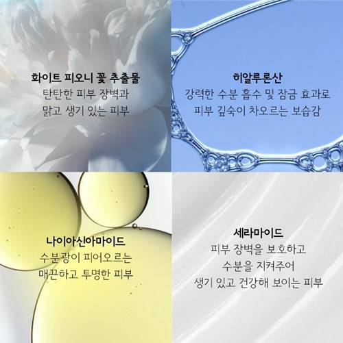 탄탄한 피부장벽과 맑고 생기있는 피부로 가꿔주는 화이트 피오니 꽃 추출물, 강한 수분 흡수 및 잠금 효과를 주는 히알루론산, 수분광이 피어올라 매끈하고 투명한 피부로 만들어주는 나이아신아마이드, 피부 장벽을 보호하고 수분을 지켜주는 세라마이드가 그 주요 4가지 핵심 성분입니다.